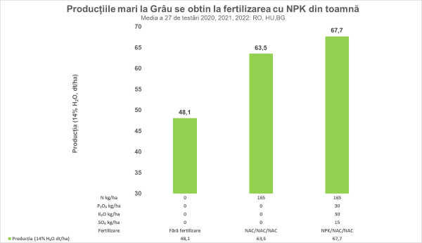 Rezultatele obtinute in 27 teste de fertilizare la cultura graului (2020-2022, Romania, Ungaria, Bulgaria) confirma ca aplicarea in toamna a elementelor N(azot)P(fosfor)K(potasiu) chiar si intr-o doza moderata (200 kg/ha COMPLEX 15/15/15 +8SO₃ +Zn) asigura sporuri semnificative de productie fata de varianta nefertilizata sau fata de varianta fertilizata doar cu N.